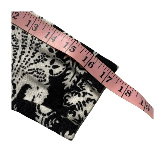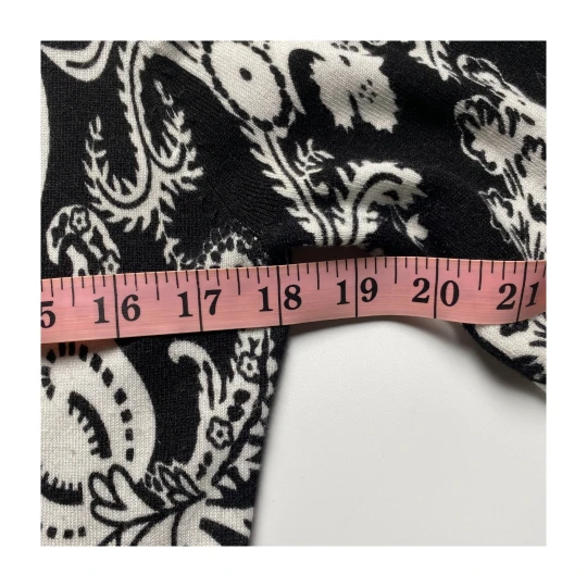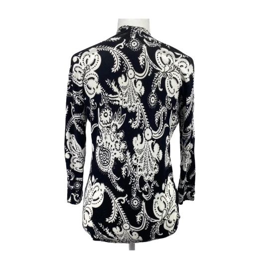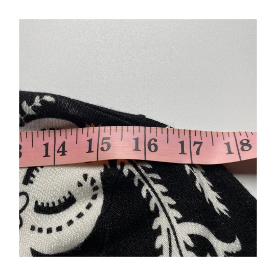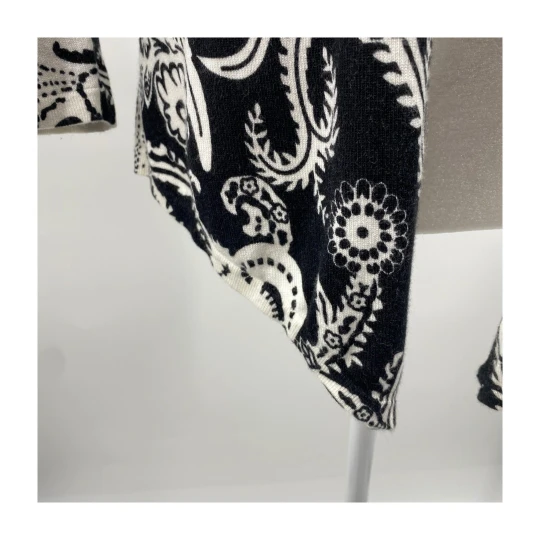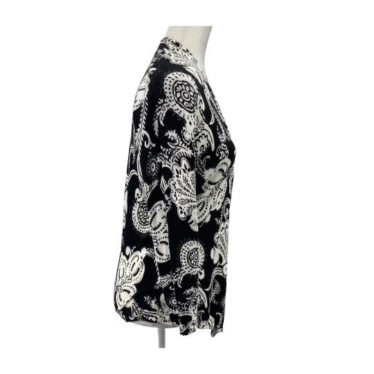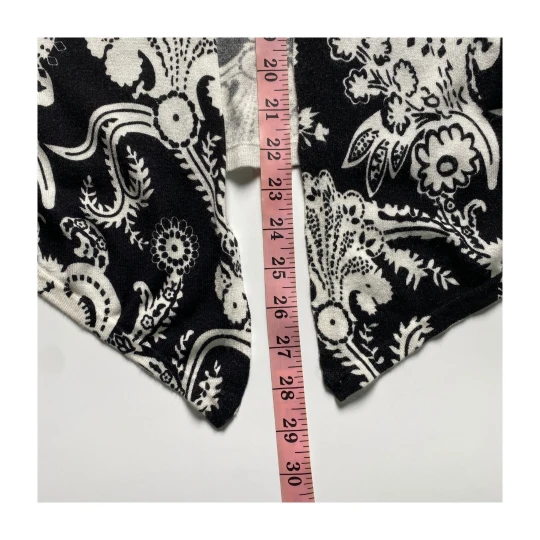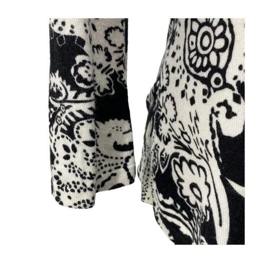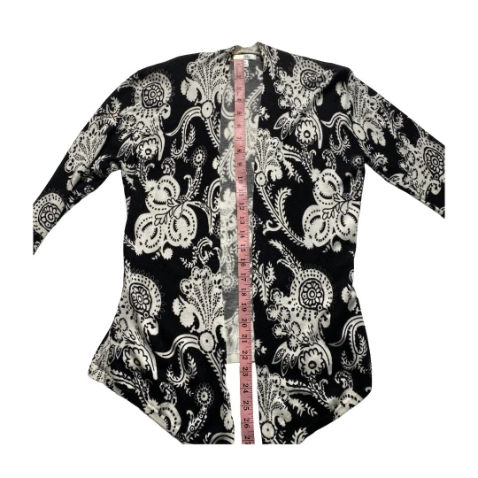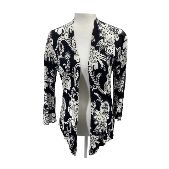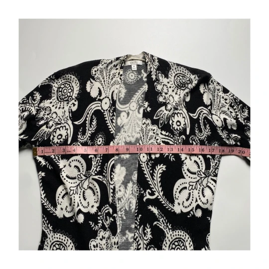 Upgrade your layering game with this black white paisley cardigan by Cache. Featuring an open front and draped hemline, this lightweight piece adds a sophisticated touch to workwear or casual outfits.