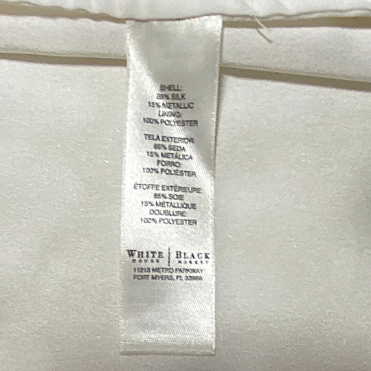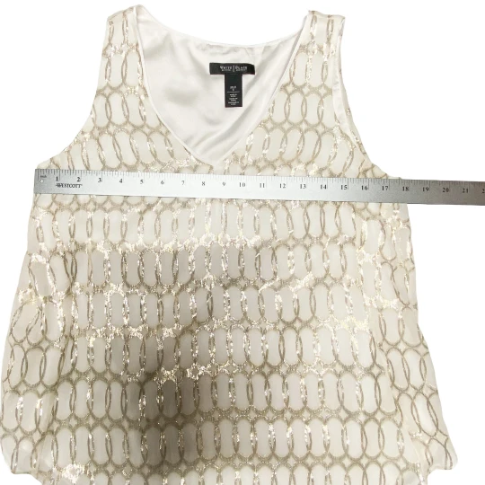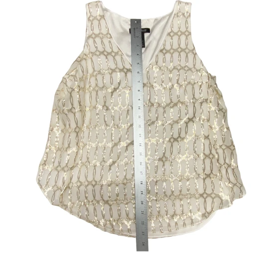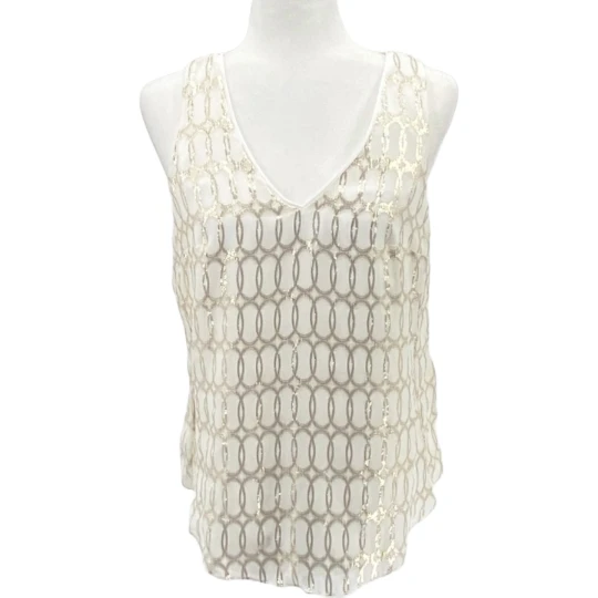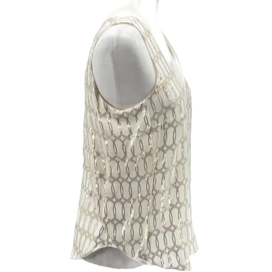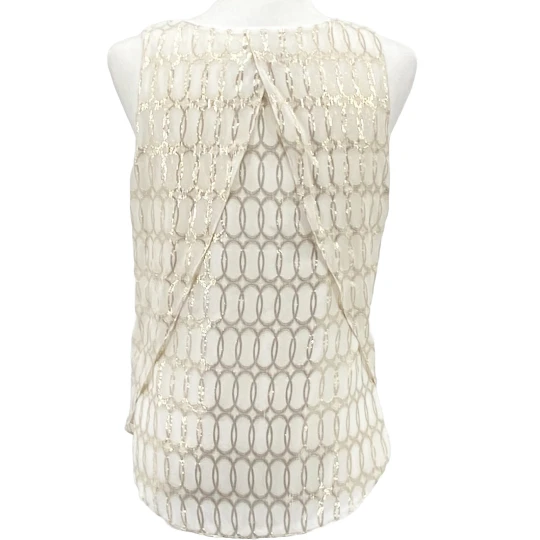Add a touch of luxe to your wardrobe with this White House Black Market silk sleeveless blouse. Designed in a cream tone with shimmering gold oval print, this sleeveless top features a V-neckline and a draped open-back overlay, making it an effortless choice for both office chic and evening outings.