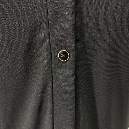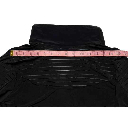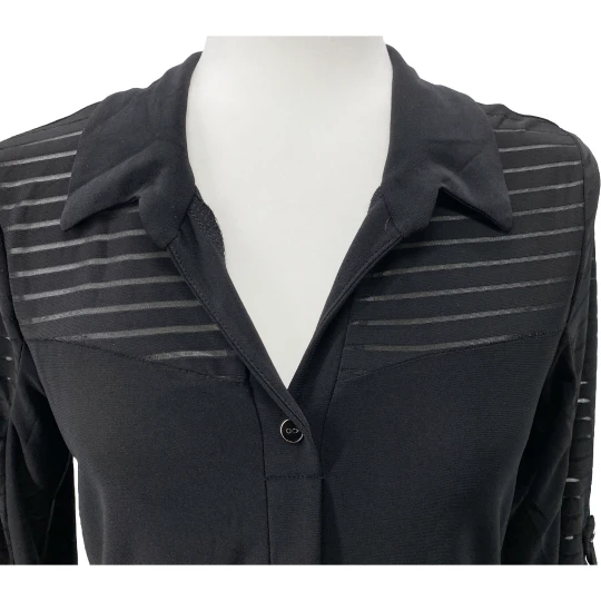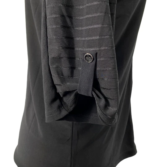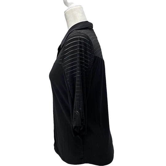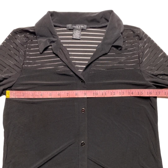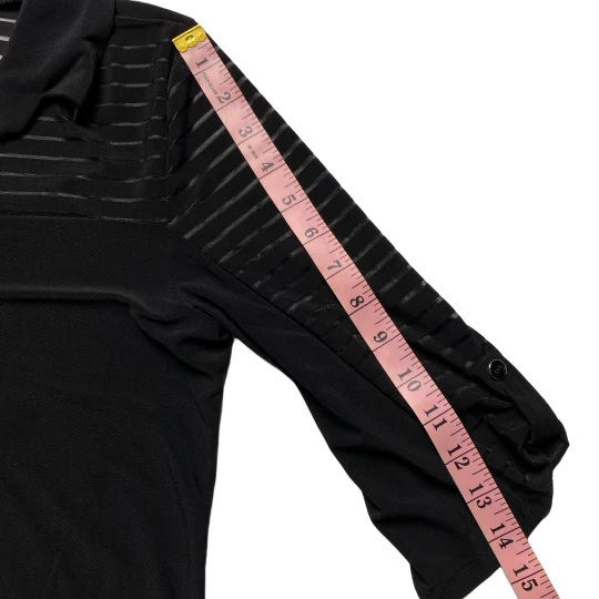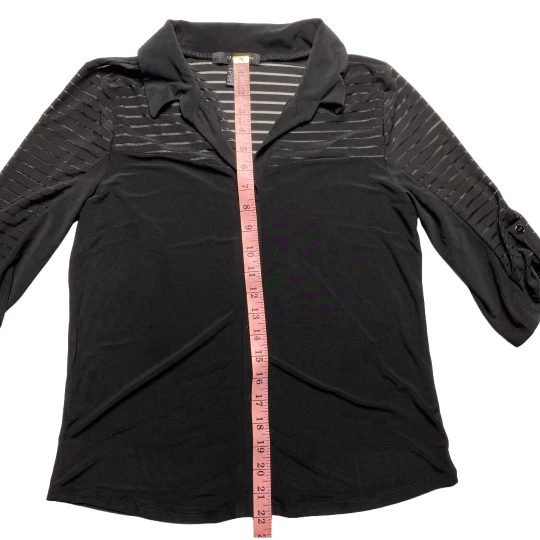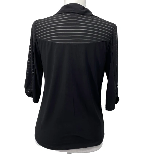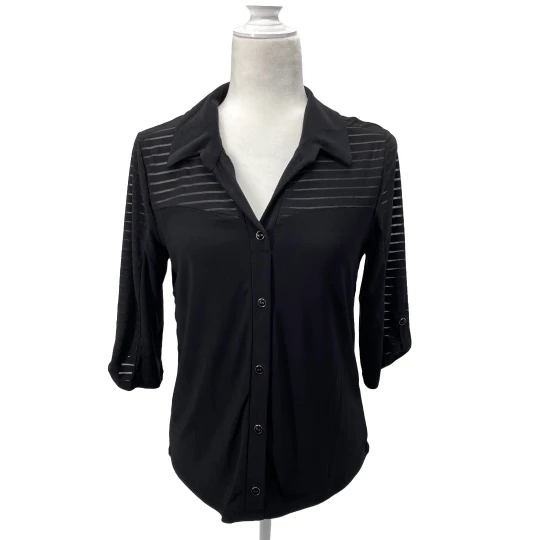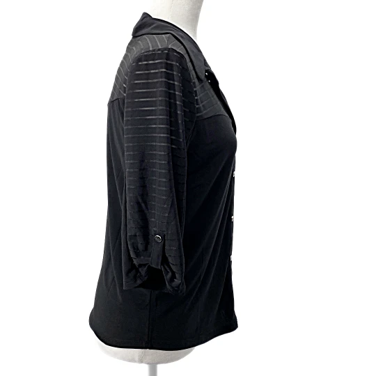 Add polished style to your petite wardrobe with this Adele & May Women’s Petite Black Button-Up Blouse. Designed with sheer stripe detailing on the shoulders and sleeves, a classic collared V-neckline, and practical roll tab 3/4 sleeves, this blouse effortlessly transitions from desk to dinner. Crafted in a soft, lightweight polyester-spandex blend, it offers a comfortable fit with just the right amount of stretch.